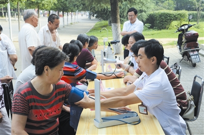 在三五八社区,三院的医生们给小区内的居民测血压。本报见习记者 买祥发 摄