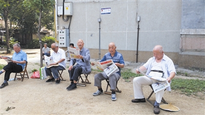三五八社区居民围坐在一起看《信阳晚报》。 本报见习记者 周 静 摄