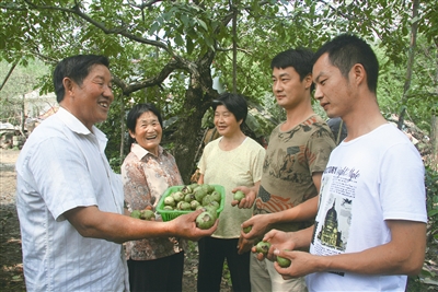 共产党员、平桥区五里办事处七桥村农民果树栽培专家许远成,利用当地皮柳树培育嫁接的核桃树,今秋又迎来了丰收年。他对周围的群众说:“无论是谁,只要愿意来学习果树栽培嫁接技术,我都愿无私将这门技术传授给他……”这充分体现了一个共产党员无私奉献的精神。图为8月30日,许远成正在向前来取经的群众介绍核桃的经济价值。
