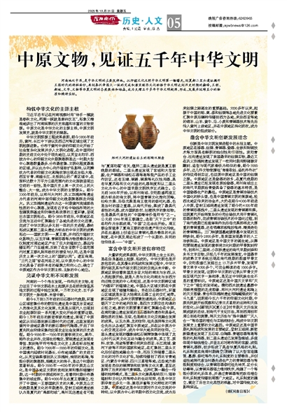 中华文明探源工程成果表明,距今5800年前后,黄河、长江中下游以及西辽河等区域出现了文明起源迹象。分布于黄河中游的仰韶文化开始了社会复杂化发展并步入文明化进程,在中国同时期的史前文化中处于领先地位,以灵宝北阳平、西坡为中心的仰韶文化中期聚落群是这一时期大型中心聚落数量最多、分布最密集、文明化程度最高的区域,并以此为中心向外强势扩张影响,以花瓣纹为代表的仰韶文化彩陶纹饰出现在东临大海、西至甘青、南越长江、北抵阴山的广袤区域中,在面积达数十万平方公里范围内的文化面貌呈现出空前的一致性,是中国历史上第一次文化上的大整合、大一统,成为中华文明的主要源头。距今5300年前后,以郑州大河村、巩义双槐树等遗址为代表的河南中部仰韶文化晚期聚落群走向强大。巩义双槐树遗址作为这一时期黄河流域都邑性质的中心聚落,发现有近乎沿中轴线布局的大型建筑群基址和防御色彩浓厚的三重环壕,呈现出古国文明形态。距今3800年前后,中原地区在交流与互动中汇聚融合了各地先进的文化因素,完成了中华文明从多元到一体的历史进程,最终形成以夏都二里头遗址为标志的中华文明的成熟形态——国家文明——夏王朝,并向四方辐射文化影响力,以玉牙璋、青铜容器等为物质载体的礼仪制度对周边地区产生了巨大的辐射力,最远传播至两广乃至越南,反映了在东亚数千公里范围内对夏王朝礼制和政权的接受与认同,这是中国历史上第一次文化上的“国家认同”。逮至商周,“三代之居”皆在河洛之间,以中原为中心的中华文化具备了前所未有的凝聚力和向心力,确立了中原地区作为中华文明主根、主脉的中心地位。